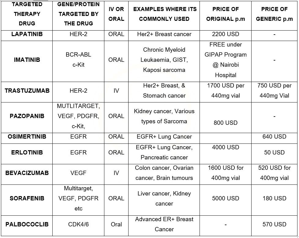 Targeted therapy is available in most major hospitals like Nairobi Hospital Cancer Centre, Agakhan, MP Shah Hospital, and Kenyatta Hospital among others. Availability of stock may vary with prevailing circumstances. Ask your oncologist where you can access them. Both private insurance and NHIF come in handy to partially or fully offset the cost.